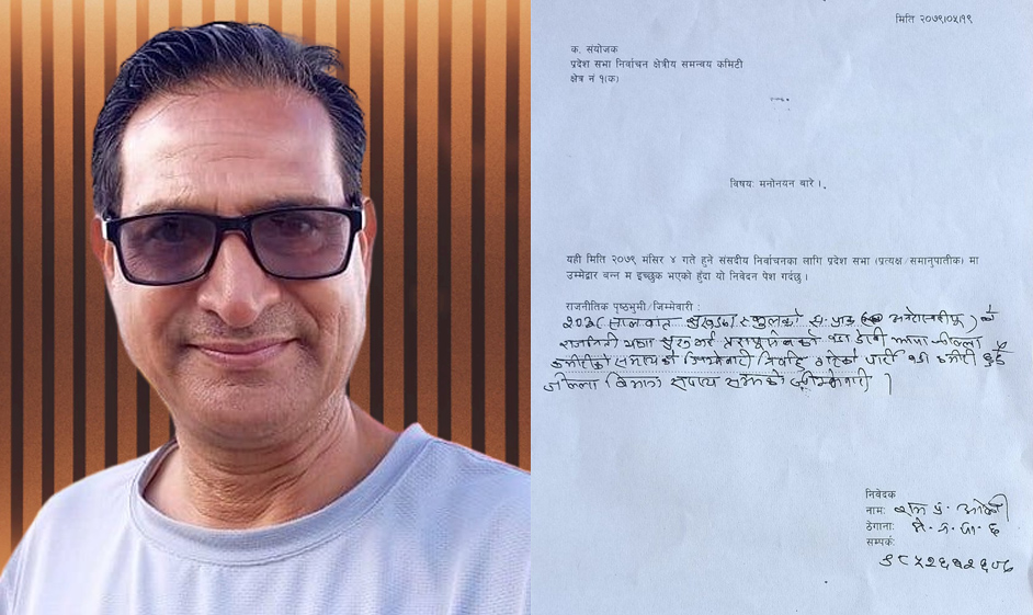 मेचीनगर । लामो समयदेखि निरन्तर नेकपा(एमाले)मा कृयाशिल कार्यकर्ता झापा मेचीनगरका राम ओलीले पनि उम्मेद्वार बन्ने ईच्छा देखाएकाछन् ।मंसीर ४ गते हुने प्रतिनिधि र प्रदेशसभाको निर्वाचनमा उनले झापा क्षेत्र नं १ (क)बाट प्रदेशसभामा प्रत्यक्ष वा समानुपातिकका लागि उम्मेद्वार बन्ने चाहना देखाएकाछन् ।आज उनले पार्टीमा आफ्नो उम्मेद्वारी दर्ज गराएकाछन् । झापामा बामपंथी बिध्यार्थी आन्दोलनदेखि जोडिएका ओलीले सामाजिक सञ्जालमार्फत पार्टीमा आफुले दिएको मनोनयन पत्र सार्वजनिक समेत गरेकाछन् ।सामाजिक सञ्जालमा उनले आफु २०३८सालदेखि नै बामपंथी आन्दोलनमा जोडिएको भएता पनि आज सम्म कुनै संसदीय क्षेत्रको जिम्मेवारी नलिएको उल्लेख गर्दै यसपटक आफुले उम्मेद्वारीका लागि पार्टीमा निवेदन गरेको बताएकाछन् । ओली निरन्तर नेकपा(एमाले)का विभिन्न जिम्मेवारीमा रहेर कृयाशिल एमालेका अगुवा कार्यकर्ता रुपमा परिचित रहेकाछन् ।