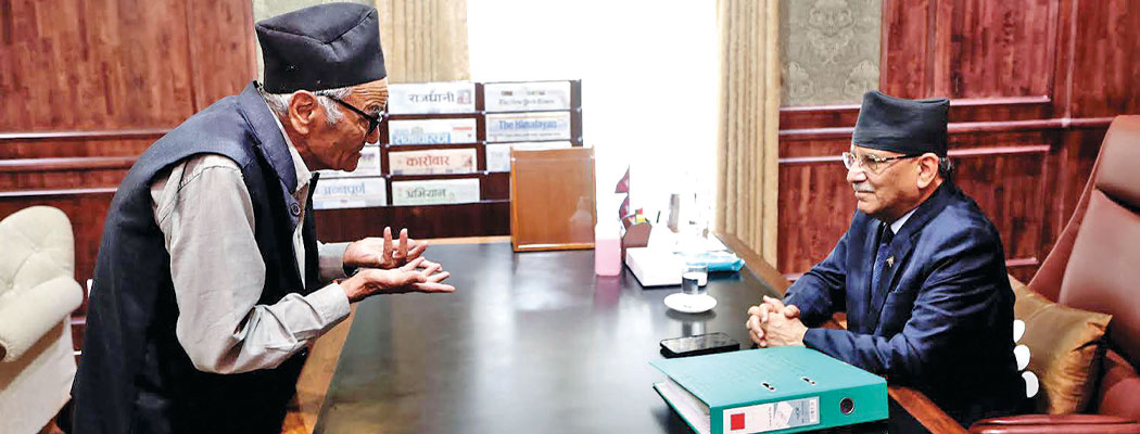 प्रधानमन्त्री पुष्पकमल दाहाल ‘प्रचण्ड’ सँग वीरसिंह भण्डारी कुराकानी गर्नुहुँदै ।
