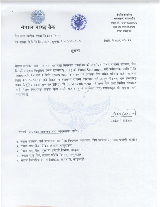 महालेखा नियन्त्रक कार्यालयको अनुरोधमा शुक्रबार निर्देशन जारी गर्दै राष्ट्र बैंकले असार २३ र ३० गते शनिबार राजस्व संकलन, चेक क्लियरिङ एवम् विद्युतीय रकम ट्रान्सफर (ईएफटी)को फण्ड सेटलमेन्ट गर्ने प्रयोजनका लागि बैंक तथा वित्तीय संस्थालाई व्यवस्था गर्न अनुरोध गरेको हो ।