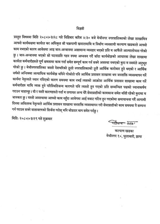 मेचीनगर । मेचीनगर नगरपालिकाको कर अधिकृत चक्रपाणी खनालमाथि पूर्वमेयर कल्याण खड्काले विहिबार गरेको दुव्र्यव्यहारप्रति क्षमा मागेकाछन् । आज एक विज्ञप्ति जारी गर्दै उनले आफुले आवेशमा आएर सो घट्ना हुन पुगेकाले क्षमा मागेकाछन् । उनले अफु आवेसमा आएर जानअन्जानमा भएको विहिबारको घट्नामा गल्ती भएको स्विकार गर्दै विज्ञप्तिमा आर्थीक प्रशासन शाखामा जनशक्तिको ब्यवस्थापनका लागि समेत माग गरेकाछन् ।