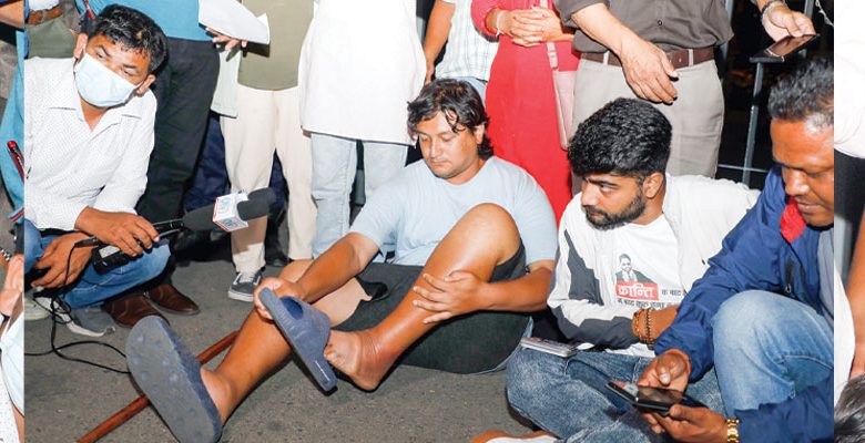 महानगरसँगको सहमतिपछि बसेर चप्पल फुकाल्दै ईः । तस्बिर : विकास द्वारे