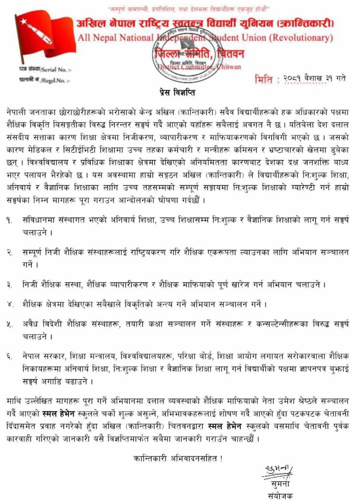 स्मल हेभेन स्कुलले चर्को शुल्क असुल्ने, अभिभावकहरूलाई शोषण गर्दै आएको हुँदा पटकपटक चेतावनी दिँदासमेत प्रवाह नगरेको हुँदा अखिल (क्रान्तिकारी) चितवनद्वारा स्मल हेभेन स्कुलको बसमाथि चेतावनी पुर्वक कारर्बाही गरेको क्रान्तिकारीले जनाएको छ ।