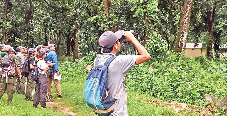 Tika Ram Giri, a senior nature guide and a trainer, was leading a field trip for nearly 33 participants including two women in the advanced nature guide training. He stressed the importance of regular advanced training for nature guides, stating that they need updated knowledge about species, forest laws, and policies to effectively perform their duties.