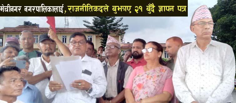 झापाको मेचीनगर नगरपालिकामा यहाँका ६ राजनीतिक पार्टीले आज (शुक्रबार)२१ बुँदै ज्ञापन —पत्र बुझाएकाछन ।नेपाली काँग्रेस,नेकपा(माओवादी केन्द्र),राष्ट्रिय स्वतन्त्र पार्टी, राप्रपा, जनता समाजवादी पार्टी र नेकपा(एकीकृत समाजवादी)का तर्फबाट ज्ञापन पत्र बुझाईएको हो ।