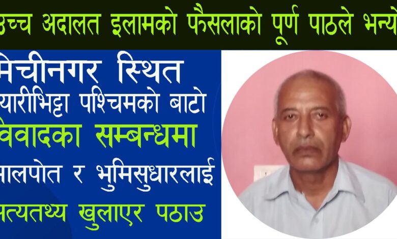 मेचीनगर नगरपालिका स्थित प्यारीभिट्टा बसपार्कबाट पश्चिम(भद्रपुर सडकसँग जोडिएको)बाटोका विवादका विषयमा उच्च अदालत इलामको पूर्णपााठ सहितको फैसला आएको निवेदक (वादी) होमनाथ प्रसाईले बताएकाछन् । आज (वुधबार) निवेदक प्रसाईले आफ्नै निवासमा पत्रकार भेटघाटको कार्यक्रम गर्दै फैसलाका विषयमा जानकारी गराएका थिए । उनका अनुसार लामो समयदेखि विवादको रुपमा आएको सो बाटोका सम्बन्धमा अदालतले भूमिसुधार तथा मालपोत कार्यालय झापालाई बाटो विवादका विषयमा कानुन अनुसार आवाश्यक छानबिन गरि कानुन बमोजिम गर्न अदालतले आदेश दिएको निवेदक प्रसाईले पत्रकार सम्मेलनमा बताए ।