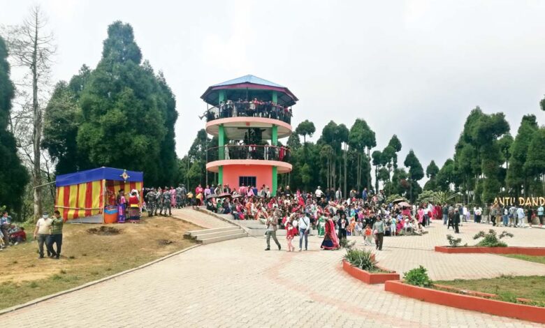 अन्तुडाँडामा सूर्योदयको दृश्यावलोकनका लागि बनाइएको भ्यु टावरमा पुगेका पर्यटक । तस्बिर : कोकिला ढकाल