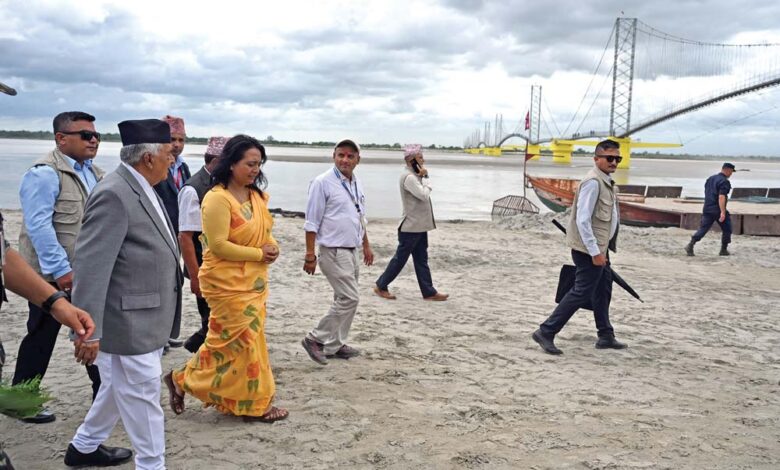 राष्ट्रपति रामचन्द्र पौडेल सुस्तामा निर्मित त्रिवेणी महेशपुर (सुस्ता) मल्टिस्पान झोलुङ्गे पुलको बिहीबार उद्घाटनपछि अवलोकन गर्नुहुँदै । तस्बिर : राष्ट्रपति कार्यालय