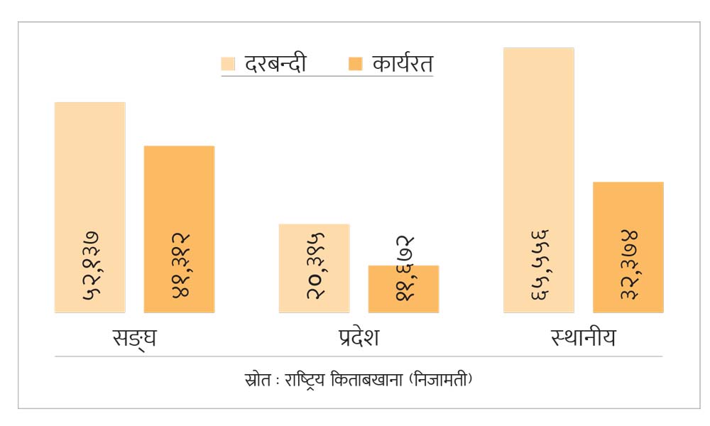 राष्ट्रिय किताबखाना (निजामती) का अनुसार सङ्घ, प्रदेश र स्थानीयसमेत तीन वटै तहमा गरी कुल एक लाख ३८ हजार १२४ दरबन्दीमध्ये ८५ हजार ३५८ वटा मात्र दरबन्दीमा कर्मचारी कार्यरत रहेको देखिन्छ । सङ्घीय र प्रदेश लोक सेवा आयोगबाट वार्षिक रूपमा करिब नौ हजारको हाराहारीमा कर्मचारीको दरबन्दी पूर्तिका लागि सिफारिस हुँदै आएको जनाइएको छ ।