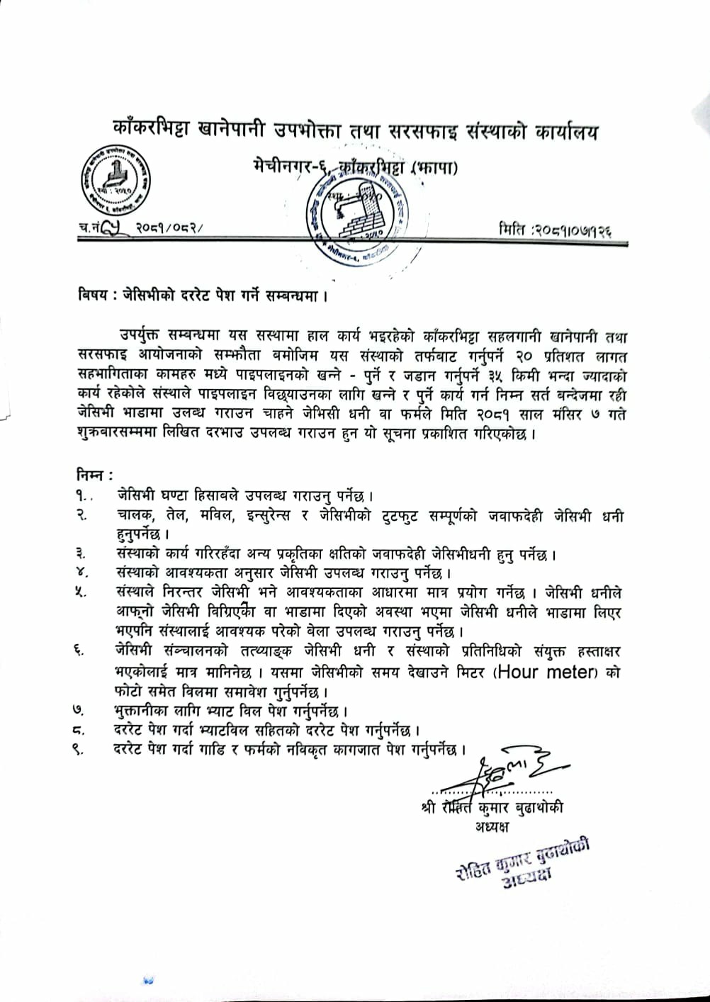 काँकरभिट्टा खानेपानी उपभोक्ता तथा सरसफाइ संस्थाको जेसीभीको दररेट पेश गर्ने सम्बन्धी सुचना