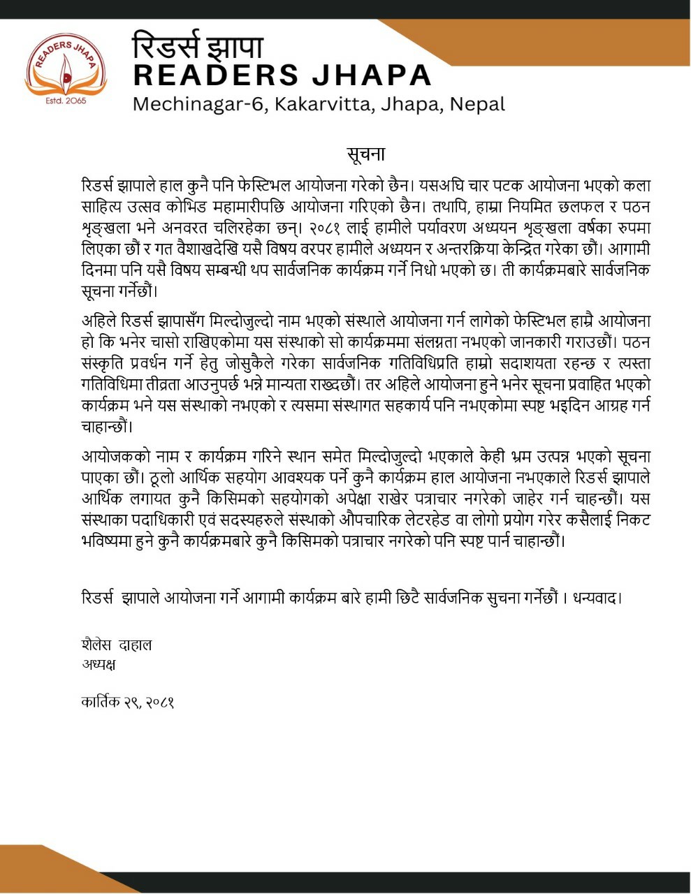 रिडर्स झापाको सुचना ।