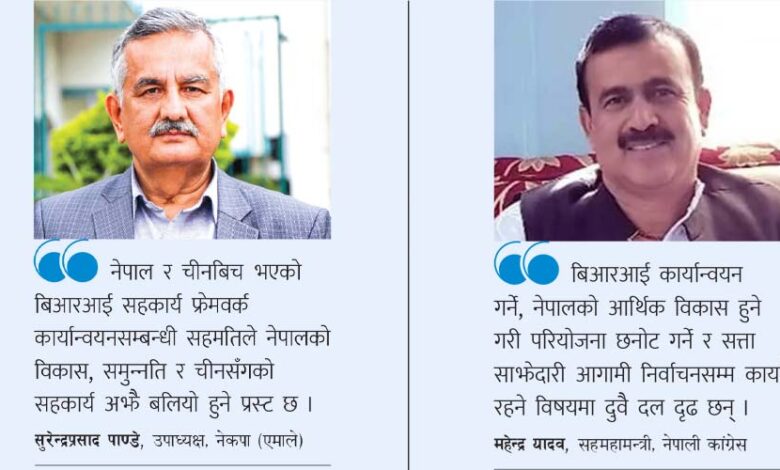 एमाले उपाध्यक्ष सुरेन्द्रप्रसाद पाण्डे र कांग्रेस सहमहामन्त्री महेन्द्र यादवले नेपाल र चीनबिच भएको नौबुँदे विकास सहकार्यसम्बन्धी सहमति, चीनका राष्ट्रपति सी चिनफिङले नेपाललाई नौ अर्ब रुपियाँको अनुदान घोषणा र बिआरआई सहकार्य फ्रेमवर्क कार्यान्वयनसम्बन्धी सहमतिले नेपालको विकास, समुन्नति र चीनसँगको सहकार्य अझै बलियो हुने प्रस्ट पार्नुभयो । उहाँहरूले नेपाल र चीनबिच विगतमा भएका सम्झौता कार्यान्वयनमा पनि जोड दिनुभयो । उपाध्यक्ष पाण्डेले भन्नुभयो, “कांग्रेस–एमालेबिच गहन परामर्श भयो । छलफलको निष्कर्षका आधारमा बिआरआई सहकार्य फ्रेमवर्कमा हस्ताक्षर भयो । यसमा सहभागी नभएका कसैले प्रश्न उठाउनुको अर्थ हुँदैन । सहमति कार्यान्वयन अघि बढ्छ ।”