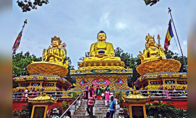 Beyond its religious significance, Swayambhu is also a UNESCO World Heritage Site. As one ascends from Bhagwan Pau, one passes three gigantic Buddha statues, seated in deep meditation.