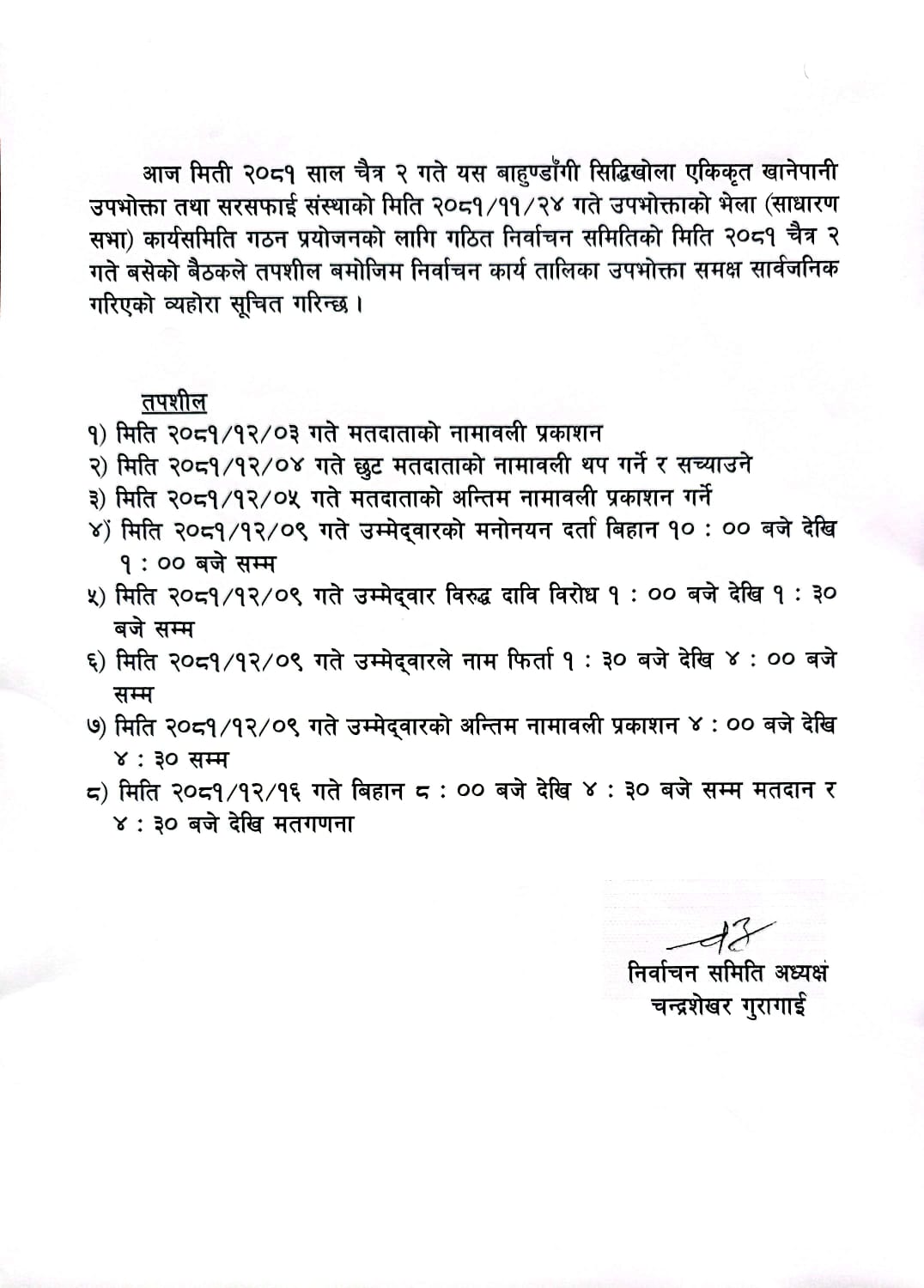 बाहुण्डाँगी सिद्धिखोला एकिकृत खानेपानी उपभोक्ता तथा सरसफाइ संस्थाको निर्वाचन सम्बन्धि तालिका सहितको सुचना
