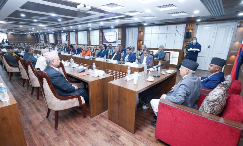 प्रधानमन्त्री केपी शर्मा ओलीको आह्वानमा सिंहदरबारमा आइतबार बसेको गणतन्त्र पक्षधर राजनीतिक दलको बैठक । तस्बिर : प्रम सचिवालय