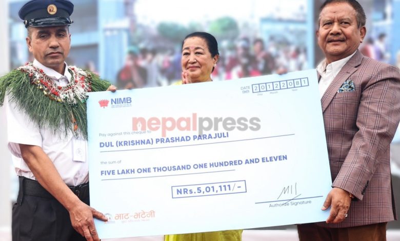 मेचीनगर । राजतन्त्रका पक्षधरहरुले चैत १५ गते गरेको आन्दोलनको क्रममा भाटभटेनी सुपरमार्केटमा लुटपाट रोक्न बहादुरी देखाउने सुरक्षा गार्ड दुलप्रसाद पराजुलीले पाँच लाख नगद र पाँच ग्रेड बढुवा पुरस्कार पाएकाछन् ।