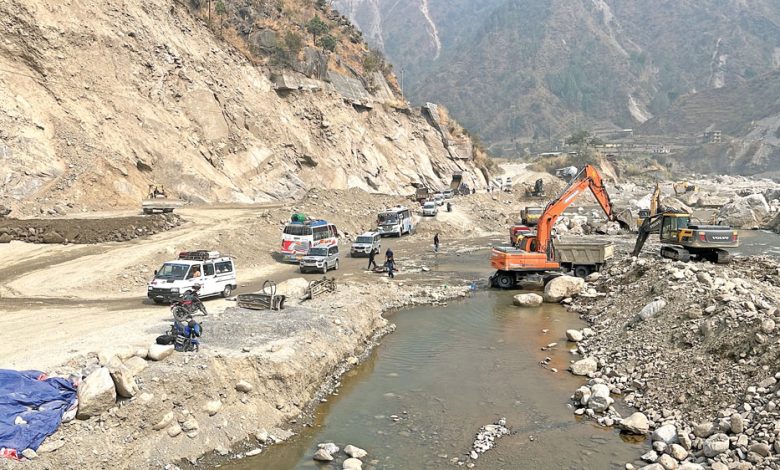 बाढीबाट क्षति भएको बिपी राजमार्गमा वर्षायाममा सवारी सञ्चालन गर्नका लागि सडकको उचाइ बढाउन प्रयोग गरिएका उपकरण ।