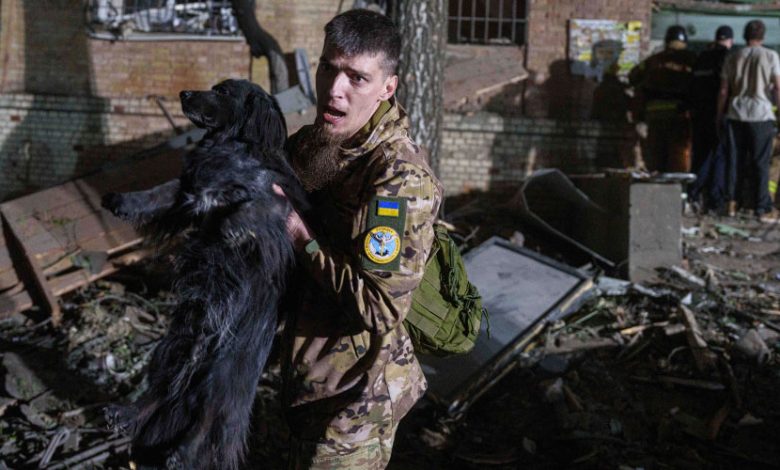 Photo: AP Ukraine serviceman holding dog in Kyiv, Ukrine.