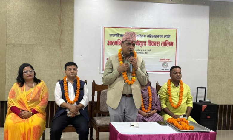 नेपालगन्ज÷ मुस्लिम महिलाहरुका लागि आत्मनिर्भर एबँ नेतृत्व बिकास सम्बन्धी तीन दिने तालिम नेपालगन्जमा सुरु भएको छ । सामाजिक बिकास डिभिजन कार्यालय बाँकेको सहयोग र बास नेपालको आयोजनामा भएको तालिमको लुम्बिनी प्रदेशका सामाजिक बिकास मन्त्री जन्मजय तिमिल्सिनाले मंगलबार उद्घाटन गरेका छन् । तालिमको उद्घाटन समारोहलाइ सम्बोधन गर्दै सामाजिक बिकास मन्त्री तिमिल्सिनाले महिलाहरुको क्षमता विकास गरी आत्मनिर्भर बनाउने उद्देश्यले तालिमको आयोजना गरिएको बताउदै तालिममा महत्वका साथ सहभागी भइ सिक्नुपर्ने बताए । मन्त्रि तिमिल्सिनाले मुस्लिम समुदायमाका महिलाहरुले विभिन्न समस्याहरुको सामना गर्नु परिरहेको बताउदै आफ्नो हक अधिकारका लागि पैरबी गर्न आवश्यक रहेको बताए । पछाडी परेका महिलाहरुको हक अधिकार र स्वतन्त्रताका लागि तालिम उपयागी हुने बताउदै उन्ले भने“ अधिकारका लागि आफै आजै बाट जाग्न जरुरी छ, समाज रुपान्तरणका लागि अबश्यक तत्वहरु के के हुन भन्ने कुरा तालिमबाट सिक्न सकिन्छ ।” तालिममा लम्बिनी प्रदेश सभा सदस्य मिना सिद्दिकी बोहराले मुस्लिम महिलाहरु यसरी तालिममा सहभाही भएको देख्दा निकै हर्षित भएको बताउदै तालिमबाट मुस्लिम महिलाहरुले आफ्नो अधिकारहरुको बारेमा जानकार हुने बताइन् । तालिमबाट केही कुरा सिकेर आफ्नो हक अधिकारहरुको लागि आफै लड्न सक्नुपर्छ उन्ले भनिन् “हाम्रो समुदायमा गर्न बाँकी अँझै धेरै कामहरु छन् आफ्नो हक अधिकारका लागि हामि आफै अघी बढ्नु पर्छ” ।