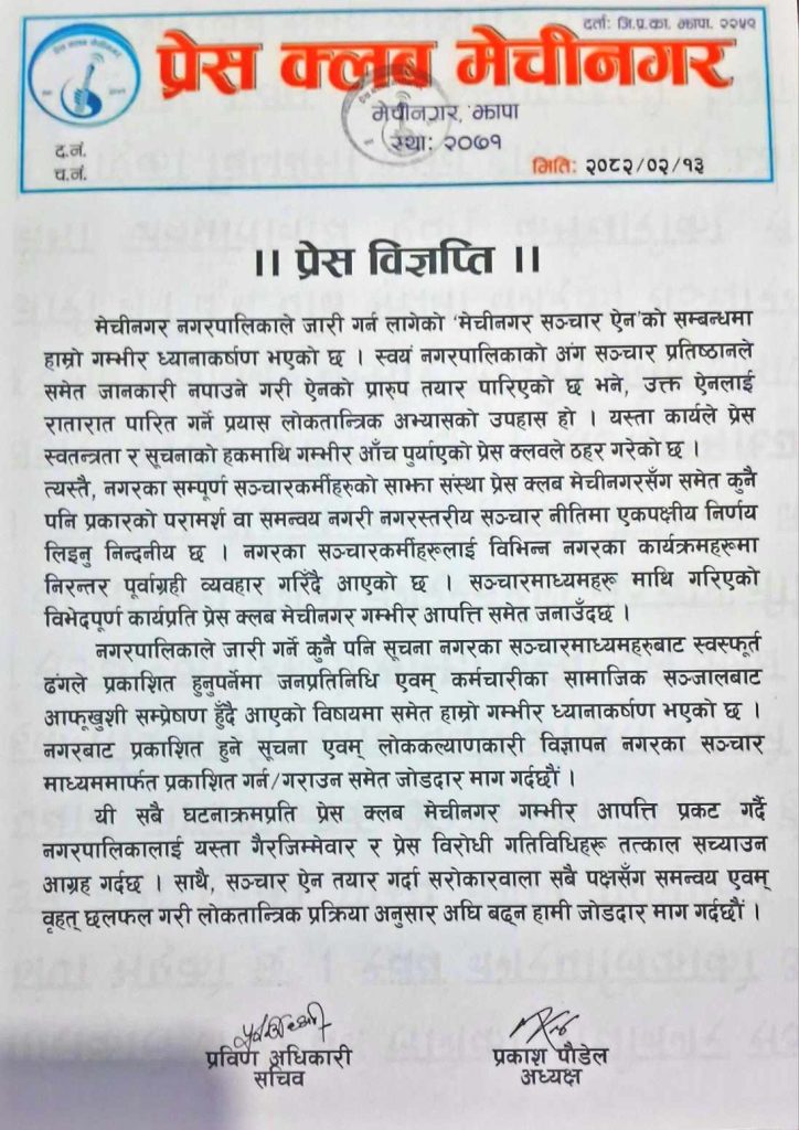 मेचीनगर । झापाको मेचीनगर नगरपालिकाले जारी गर्न लागेको ‘मेचीनगर सञ्चार ऐन’प्रति प्रेस क्लब मेचीनगरले एक विज्ञप्ति जारी गर्दै गम्भीर आपत्ति गरेको छ ।मेचीनगर क्षेत्रक पत्रकारहरुको साझा संस्था प्रेस क्लब मेचीनगरले नगरपालिकाले ल्याउन लागेको सञ्चार ऐनका बारेमा नगरपालिका स्वयमले गठन गरेको मेचीनगर सञ्चार प्रतिष्ठान , प्रेस क्लब मेचीनगर र नगरमा कृयाशिल सञ्चारकर्मीहरुलाई समेत सामान्य जानकारी समेत नदिएर लोकतान्त्रिक अभ्यासको समेत पालना नगरेको उल्लेख गरिएको छ ।नगरले उपलब्ध गराउने लोक कल्याणकारी विज्ञापन तथा स्थानीय सञ्चार माध्यामका विषयमा समेत मेचीनगर नगरपालिकाले अभिभावकीय भूमिकामा नभएर विभेद गरेको उल्लेख गरिएको छ ।नगरका सरकारी विज्ञापन स्थानीय सञ्चार माध्यामलाई उपलब्ध नगराएर नगरका कर्मचारी र जनप्रतिनिधिको फेसबुकबाट आफुखुशी सम्प्रेषण गरिएकोमा समेत गंभीर ध्यानाकषर्ण भएको उल्लेख गरिएको छ । क्लबका अध्यक्ष प्रकाश पौडेल र सचिव प्रविण अधिकारीद्धारा जारी विज्ञप्तिमा नगरपालिकाले ल्याउन लागेको सञ्चार ऐन र स्थानीय सञ्चार माध्यामका विषयमा सञ्चारकर्मीहरुका संस्था र सञ्चारकर्मीसँग बसेर आपसी समझदारीका आधार नीति नियम निमार्ण गर्न समेत माग गरिएको छ ।