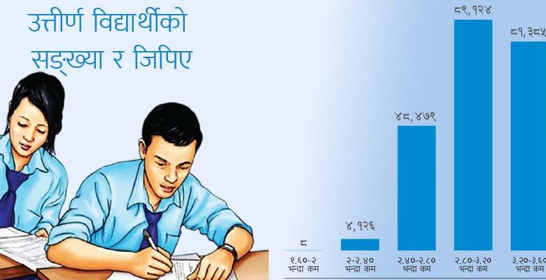 बोर्डका अनुसार जिपिए १.६० देखि २ भन्दा कम– ८ जना, जिपिए २ देखि २.४० भन्दा कम– ४,१२६ जना, जिपिए २.४० देखि २.८० भन्दा कम– ४८,४७९ जना, जिपिए २.८० देखि ३.२० भन्दा कम– ८९,१२४ जना, जिपिए ३.२० देखि ३.६० भन्दा कम– ८१,३८५ जना, जिपिए ३.६० देखि ४ सम्म– ४८,१७७ जनाले ल्याएका छन् ।गोरखापत्र दैनिकमा खबर छ ।