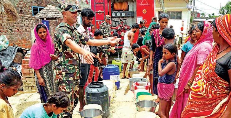 सुक्खा र खडेरीका चपेटामा परेको मधेश प्रदेशको वीरगन्ज महानगरपालिका वडा नं. १९ को विन्ध्यावासिनी, २४ को रामगडुवा नयाँ बस्तीमा नेपाली सेना, स्थानीय सरकार तथा खानेपानी संस्थानको सहकार्यमा पानी वितरण गरिँदै । नेपाली सेनाको मध्यपूर्वी अन्तर्गत श्रीजङ्ग गणका गणपति