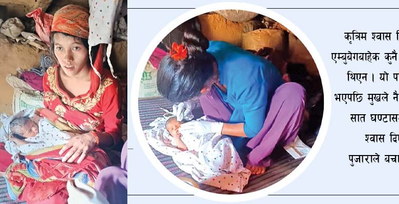 बैतडी, साउन १४ गते । स्वास्थ्य केन्द्रमा निसासिएर जन्मिएको नवजात शिशुलाई अनमीले लगातार सात घण्टासम्म मुखले कृत्रिम श्वास दिएर बचाउन सफल हुनुभएको छ । बैतडीको सिगास गाउँपालिका–४, कन्धार आधारभूत स्वास्थ्य केन्द्रमा कार्यरत अनमी जानकी पुजाराले कृत्रिम श्वास दिएर नवजात शिशुको ज्यान बचाउनुभएको हो ।