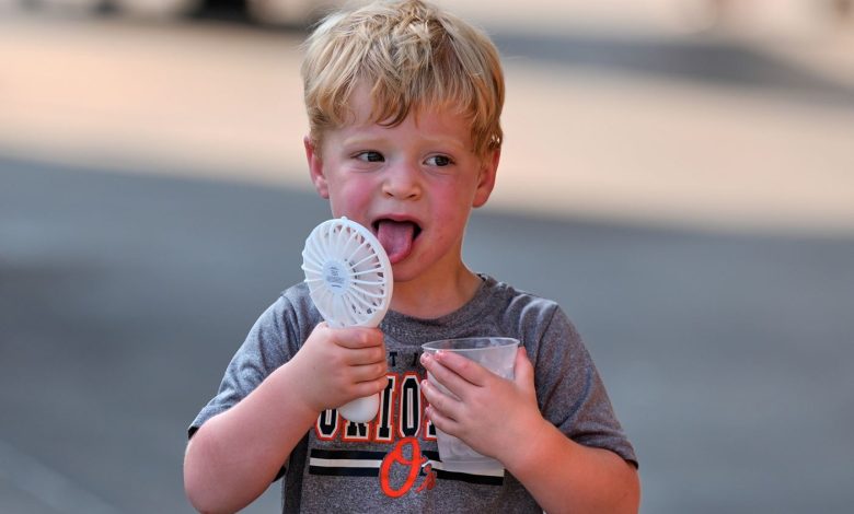 Asher Gillen, 3, uses a battery-powered fan while holding a cup of ice to cool off during hot weather in Baltimore. Photo: AP