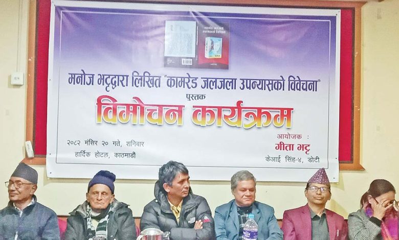 काठमाडौँ, मङ्सिर २१ गते । राष्ट्रिय जनमोर्चाका महासचिव लेखक मनोज भट्टको पुस्तक ‘कमरेड जलजला उपन्यासको विवेचना’ को लोकार्पण भएको छ । शनिबार राजधानीमा आयोजित कार्यक्रममा नेकपा (मसाल) का महामन्त्री मोहनविक्रम सिंह, पूर्वमन्त्री दीनानाथ शर्मा, नेकपा (एमाले) का उपमहासचिव प्रदीप ज्ञवालीले सो पुस्तकको विवेचनाको सार्वजनिक गर्नुभएको हो ।
