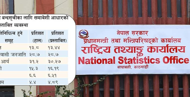 तथ्याङ्क कार्यालयका प्रवक्ता लामिछानेले दलित १३.४४, आदिवासी जनजाति २८.७, खस आर्य ३०.२७, मधेशी १६.१९, था ज्ञ ६.५१ र मुस्लिम ४.८९ प्रतिशत हुने गरी समावेशी आधार सिफारिस गरिएको बताउनुभयो । बाह्य बसाइँसराइ र जनसङ्ख्या वृद्धि दर कम रहेको समूहको प्रतिनिधित्व घटेको उहाँले बताउनुभयो ।