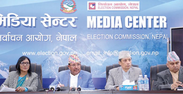 निर्वाचन आयोगद्वारा मङ्गलबार आयोजित पत्रकार सम्मेलनमा उम्मेदवारको मनोनयनबारे जानकारी दिनुहुँदै कावा प्रमुख निर्वाचन आयुक्त रामप्रसाद भण्डारी (बिचमा) लगायत पदाधिकारी ।तस्बिर : गोरखापत्र