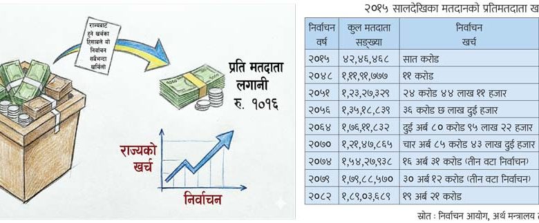 काठमाडौँ, फागुन १३ गते । शीर्षकगत खर्चमा निर्वाचनलाई खर्च स्रोत नछुट्याइने भए पनि राज्यले यसका लागि अर्बौं दायित्व बेहोर्नुपर्ने हुन्छ । मुलुकमा २०१५ सालदेखि सुरु भएको औपचारिक निर्वाचनयता सम्पन्न नौ वटा निर्वाचनमा मात्रै राज्यले अहिलेसम्म करिब ७५ अर्ब रुपियाँ खर्च गरेको छ । निर्वाचनका क्रममा राज्यसहित उम्मेदवारले गर्ने खर्चका कारण यस अवधिभर अर्थतन्त्र अल्पकालीन रूपमै भए पनि थप चलायमान बन्छ । यस हिसाबले निर्वाचन राजनीतिक घटनाक्रम मात्र नभएर राज्यबाट हुने ठुलो लगानी र अर्थतन्त्र विस्तारको आधार पनि हो ।