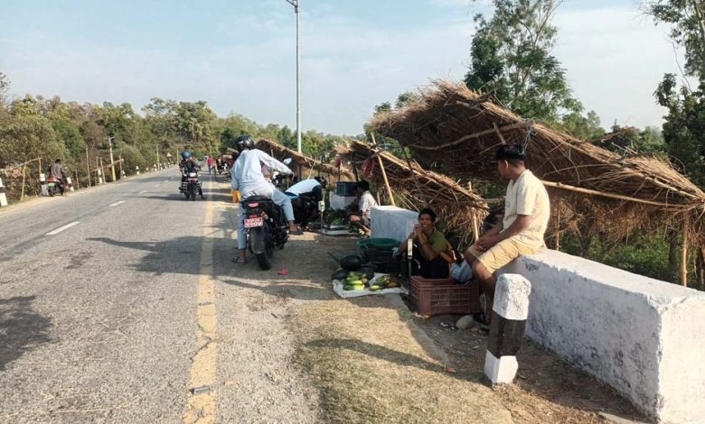 सडकछेउमा टहरा बनाएर तरकारी बिक्री गर्दै कृषक । तस्बिर : भवानीदत्त भट्ट