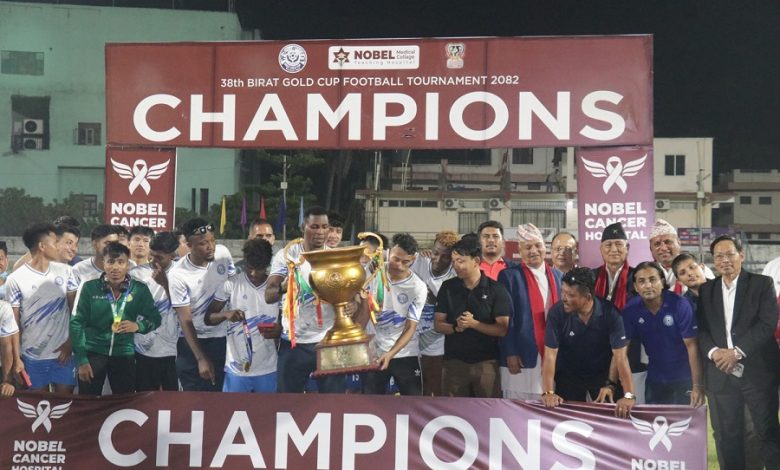 रानी (विराटनगर), वैशाख ७ गते । झापा ११ ले विराटनगरमा सम्पन्न ३८ औं संस्करणको ‘नोबेल विराट गोल्डकप’ फुटबल प्रतियोगिताको उपाधि उचालेको छ । आइतबार राति भएको फाइनल खेलमा घरेलु टोली सम्राट स्पोर्टिङ क्लबलाई २–१ गोलअन्तरले पराजित गर्दै झापाले दोस्रो पटक उपाधि चुमेको हो ।