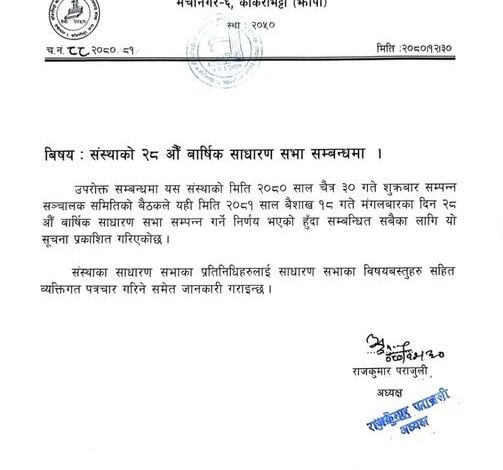 काँकरभिट्टा खानेपानी उपभोक्ता तथा सरसफाइ संस्थाको २८औँ वार्षिक साधारण सभा सम्बन्धि सुचना ।